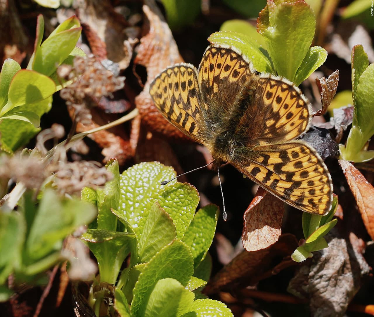 山の下では空模様が怪しく不安がよぎりましたが、登るにつれ青空が広がってきました。いくつかの雪渓を越えてヒース状のエリアに辿りつくと、小さなアサヒヒョウモンが元気に飛び回っていました。僕が子供の頃に使っていた図鑑には、この蝶だけ食草不明と書いてありました。また当時は越冬態も幼虫ですが詳細不明とあり、どこかロマンを感じると同時に厳しい生息環境であるが故に調べることもままならなかったのでは?と、子供ながらにいろいろ思いを馳せた蝶です。