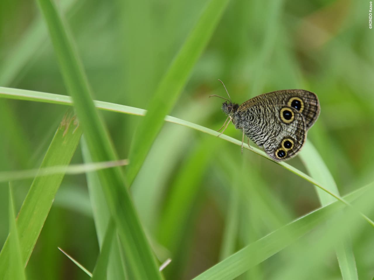 ウラナミジャノメは、京都府南部では例年第1化が5月末頃から(今年の初見は5月30日)、第2化が8月半ば頃から(今年の初見は8月14日)発生します。この化性は奈良県内4市町村の発生地や三重県内1市の発生地と同じです。今年は高温傾向が続いたためか10月半ばを過ぎても擦れた個体が見られましたが、突然10月25日に新鮮個体を確認しました。これが仮に第3化とすると第2化初見から72日目に当り、第1化初見から第2化初見までの76日間にほぼ相当します。その後、新鮮個体は11月中旬までに3回観察しました。掲載した写真は11月1日に撮影した個体です。
