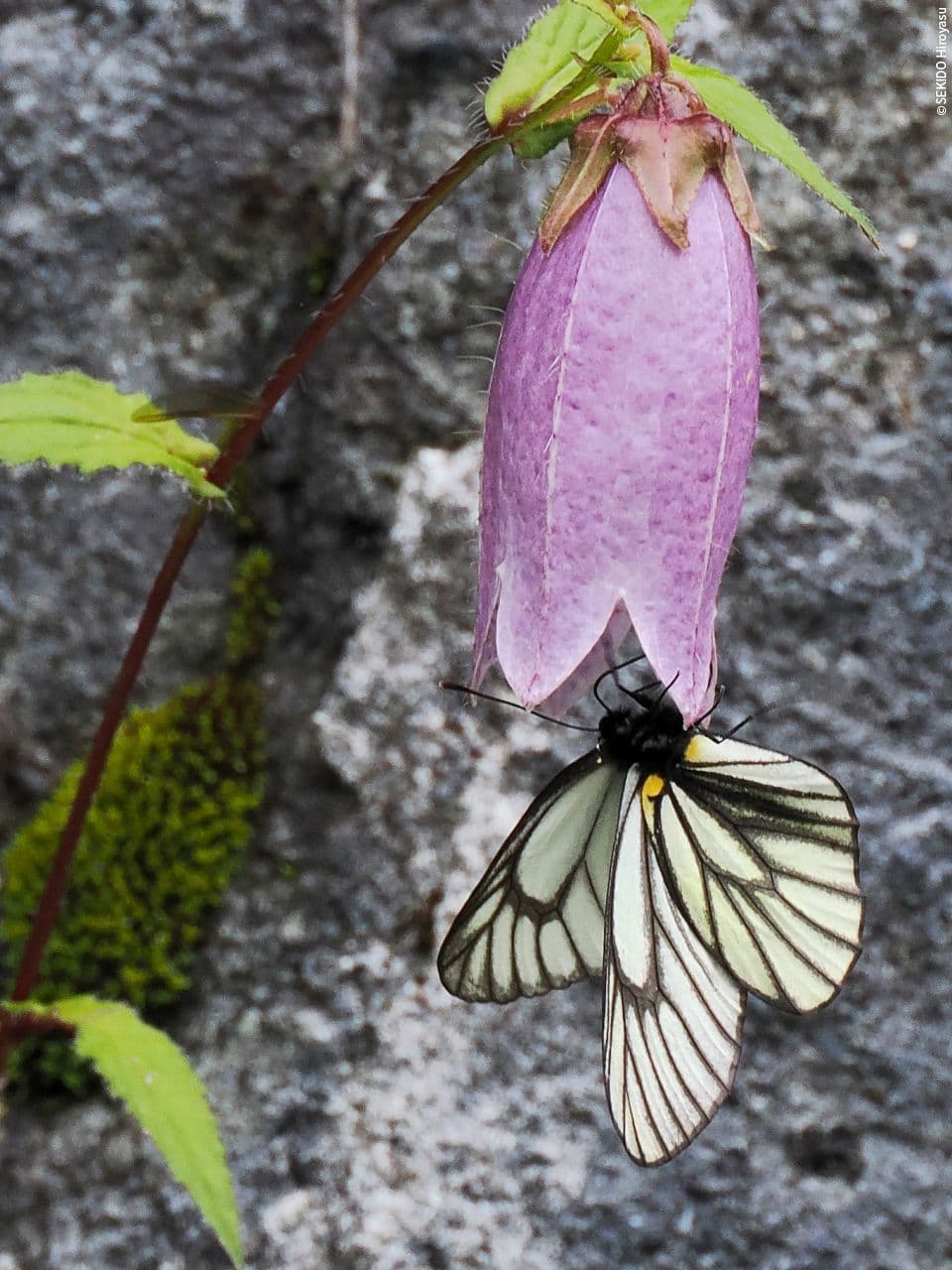 久しぶりに南アルプスのミヤマシロチョウの撮影に訪れた。ここでは、ヒヨドリバナ、キリンソウ、ウツギの吸蜜が多いのだが、初めてホタルブクロでの吸蜜が撮れた。