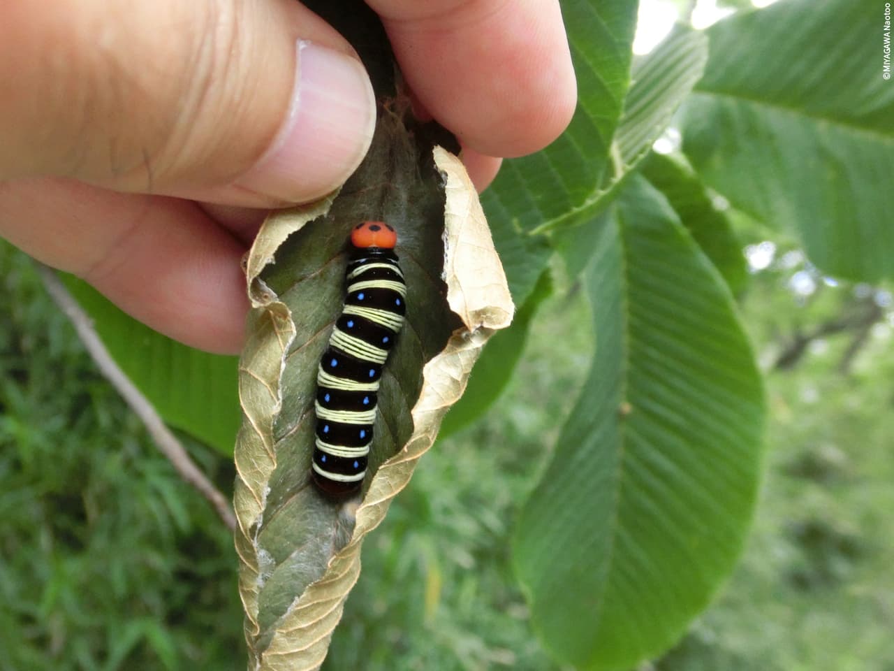 ほんの数年前までは近くの緑地公園でも、ゴールデンウイーク頃になると決まって現れていたアオバセセリですが、ここ1-2年は全く姿を見せません。ここではもう絶滅してしまったのでしょうか・・・。これは4年前に撮った、アワブキの葉の巣にいる何とも愛嬌のあるアオバセセリの幼虫です。今や貴重な写真です。