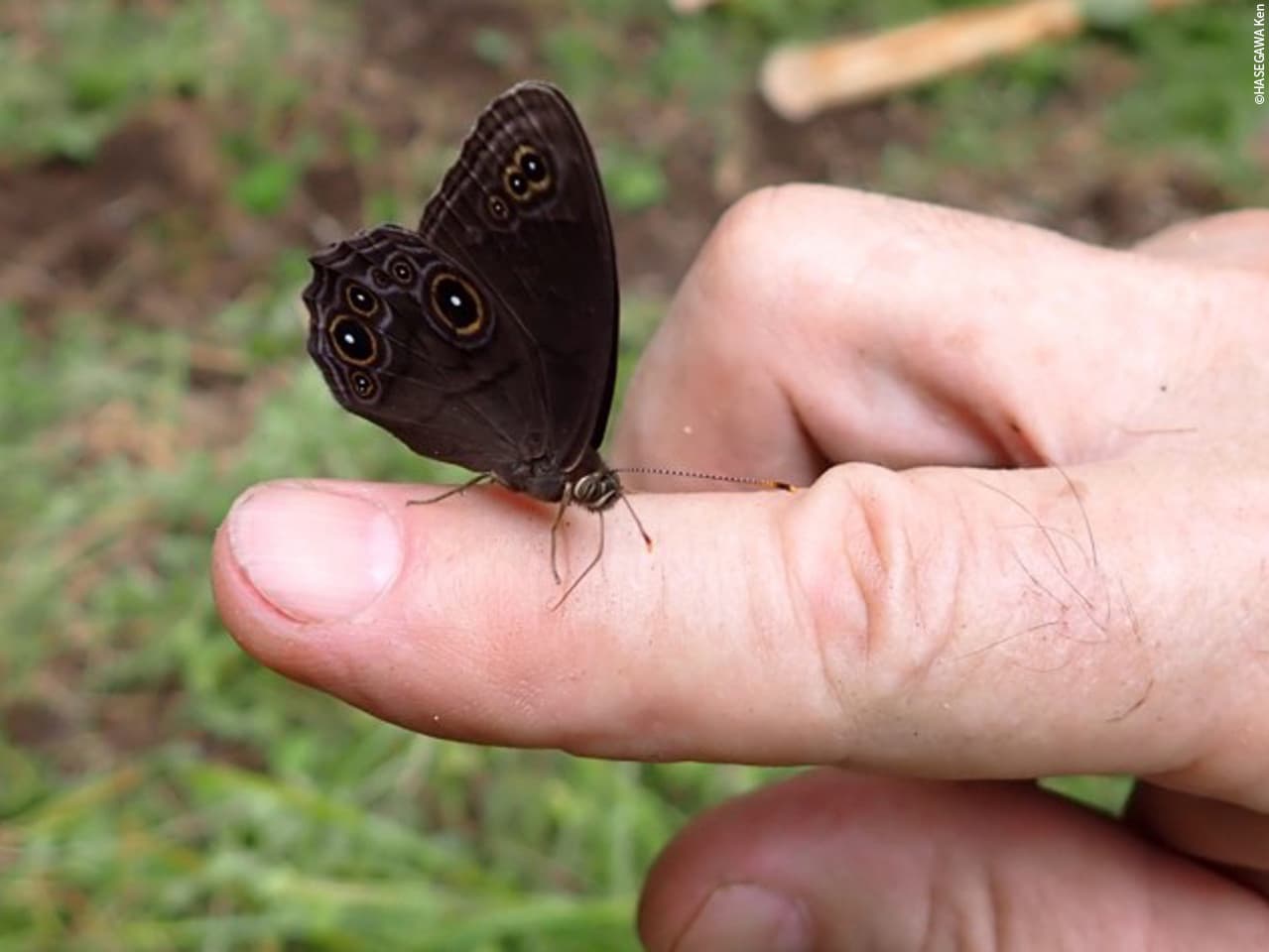 9月中旬、山仕事の休憩時、汗で湿ったズボンの腿で吸水を始めました。驚かさないよう立ち上がろうと、指先で掬い取ると、今度は指から吸水を始めました。