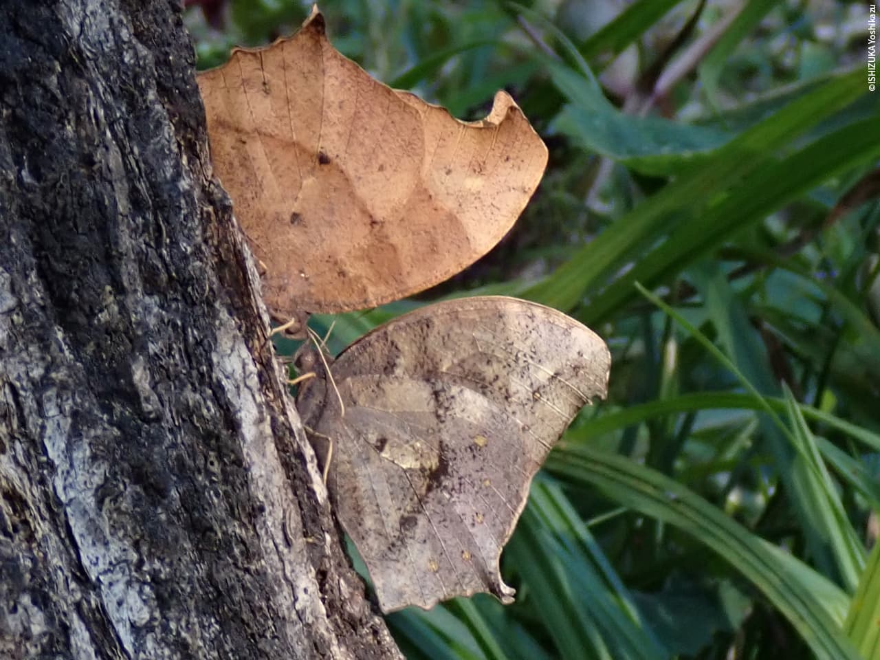 クロコノマチョウ(秋型)の♀(写真上)と♂のカップルが、トランセクト調査で毎週行く野川公園のコナラの木で顔を突き合わせて、身動きもせず、熱く見つめ合っている様子がユーモラスにも見えました。1時間後も同じ場所に同じ姿勢でとまっていました。ここではよく見かけるチョウです。クロコノマチョウの♀と♂で翅の形や色がどのように違うのかが、この写真を見ると非常によくわかり、わくわくします。カメラ:オリンパスTG6。