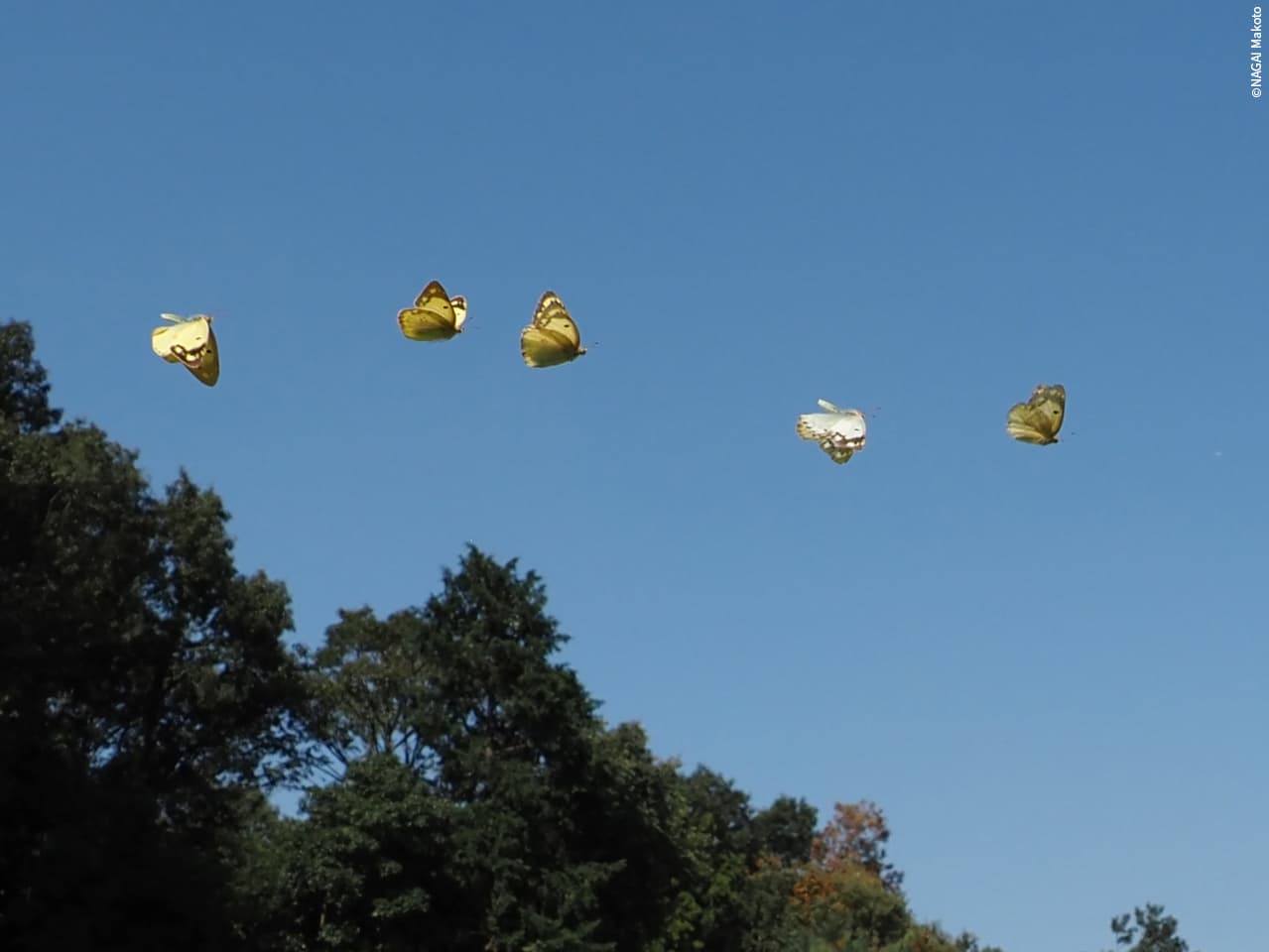 空は晴れて、青空にモンキチョウが舞った。いくつもの言葉を添えるよりも、この静寂の空間で、言葉のない豊かさを共有しているようでうれしい気持ちになる。いま、確かにチョウとともにある。