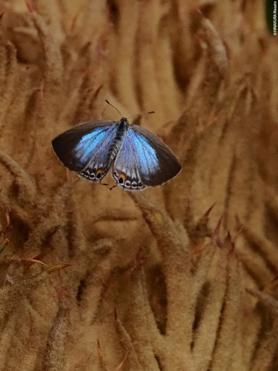 微毛に覆われためらめら燃える炎のような構造物、妖しい背景で飛ぶ蝶の姿を、縦写真で現像してみた。
