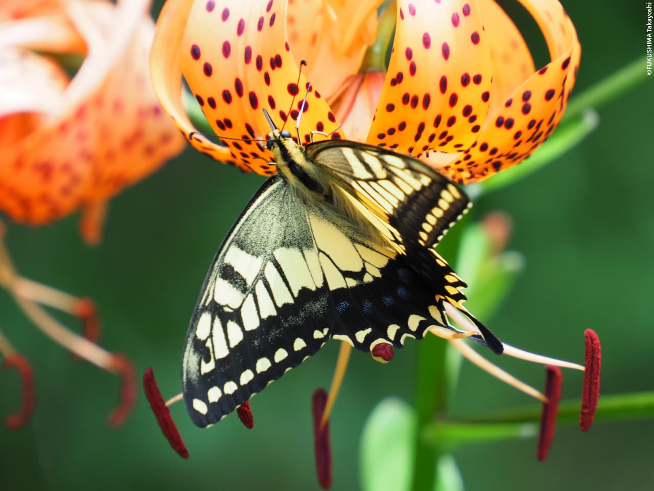 キアゲハはアゲハと並び私たちが日常目にすることの多い身近なチョウですが、その鮮やかな色彩は魅力的でシャッターチャンスに事欠きません。写真は猛暑の中、公園の池の端に咲くコオニユリにしがみつき、必死に蜜を吸うキアゲハを撮ったものです。花のおしべが、あたかもチョウがピノキオの靴を履いているような姿を想像させ、とてもユーモラスです。